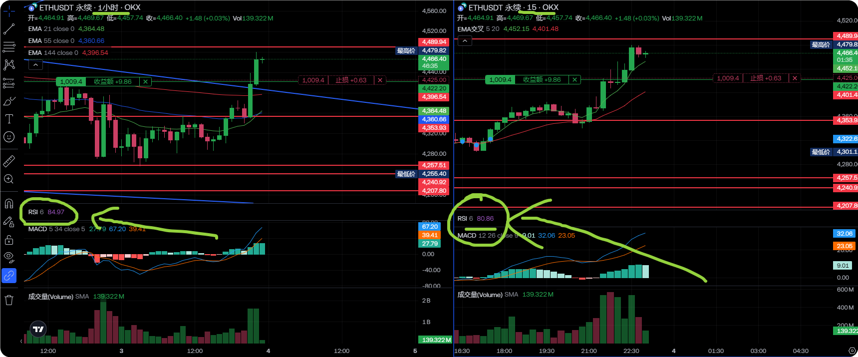 从本质上讲,RSI 会查看价格是向上移动还是向下移动幅度过大。下图是RSI指标的例子(绿色圈圈中的数字)!