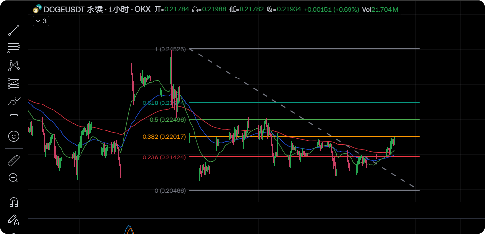 与均线结合:例如,价格回调至0.618位时,恰好也触碰到了50日或200日EMA,两者形成的“共振”会大大增强该支撑位的有效性。