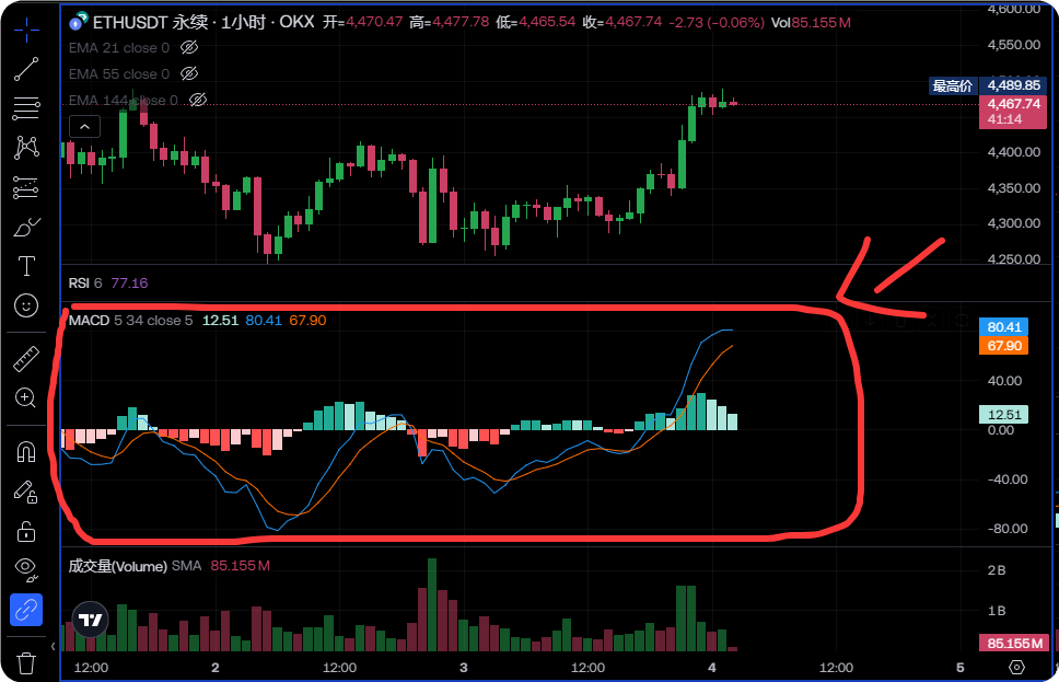 MACD线 > 0:短期EMA高于长期EMA,市场处于多头氛围。